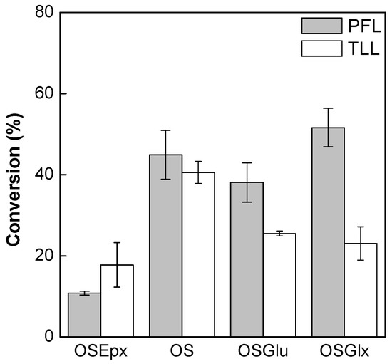 - Hirata, D.B.; Albuquerque, T.L.; Rueda, N.; Virgen-Ortíz, J.J.; Tacias-Pascacio, V.G.; Fernandez-Lafuente, R. Evaluation of different immobilized lipases in transesterification reactions using tributyrin: Advantages of the heterofunctional octyl agarose beads. J. Mol. Catal. B Enzym. 2016, 133, 117–123. [Google Scholar] [CrossRef]