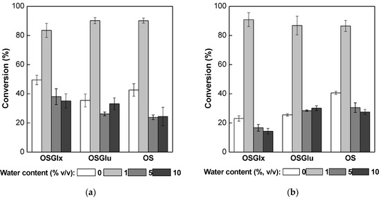 | Biocatalysts | Productivity (g/L.h) as Function of Water Amount (% v/v) in the Reaction Medium | |||