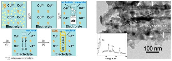 - Wang, C.L.; Sun, L.; Yun, H.; Li, J.; Lai, Y.K.; Lin, C.J. Sonoelectrochemical synthesis of highly photoelectrochemically active TiO2 nanotubes by incorporating CdS nanoparticles. Nanotechnology 2009, 20, 295601. [Google Scholar] [CrossRef] [PubMed]