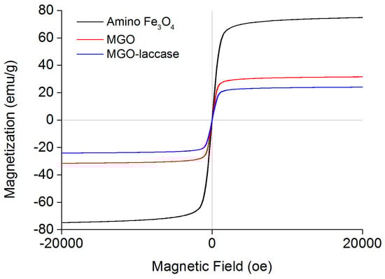 The magnetic properties of amino Fe3O4 nanoparticles, MGO, and MGO-laccase were investigated using a VSM at room temperature, and their magnetization curves are shown in Figure 2. The maximum saturation magnetizations of MGO-laccase were 24.0 emu/g, which was lower than that of amino Fe3O4 nanoparticles (74.9 emu/g) and MGO (31.5 emu/g). The lower maximum saturation magnetizations of MGO-laccase was due to the increasing amount of nonmagnetic GO and laccase on the surface after functionalization and the relatively reduced amount of Fe3O4 nanoparticles [,]. Although the maximum saturation magnetizations of MGO-laccase declined to a certain extent, it still had an accepted magnetic response for rapid separation from the reaction medium [].