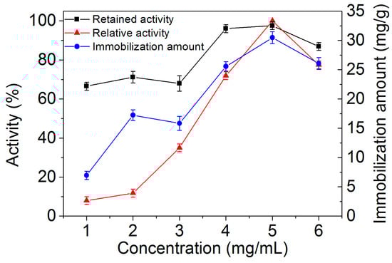 Immobilization amounts of laccase, retained activities of immobilized laccase on MGO-laccase, and relative activities of MGO-laccase at different laccase concentrations (1.0–6.0 mg/mL).
