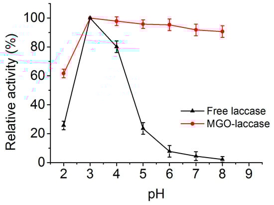 The effect of pH on the activities of free laccase and MGO-laccase were investigated at room temperature in the pH range 2.0–8.0, and the results are shown in Figure 4. The highest activity of the free laccase and MGO-laccase was individually considered as 100% and the activities at the other pH were noted proportional to the corresponding highest values. As shown in Figure 4, free laccase and MGO-laccase exhibited the maximum activity at pH 3.0. When pH was higher than 3.0, the activity of free laccase decreased sharply, while MGO-laccase showed relatively higher activity compared to that of free laccase. As reported, the stability of fungal laccases is generally higher at acidic pH. Diao and coauthors mentioned that the optimal pH for the activity of immobilized Panus conchatus laccase is 3.2 []. The improved pH tolerance of MGO-laccase against pH changes in solution is attributed to the buffer function of GO. In an acidic medium, the hydrogen ions are attracted and consumed by the negatively charged GO, which is helpful in preventing the hydrogen ions from contacting with the enzymes [,]. The improved performance might also be due to the conformational changes resulting in a suitable open conformation, with few restrictions to substrates produced by immobilization. These result is in agreement with other studies [].