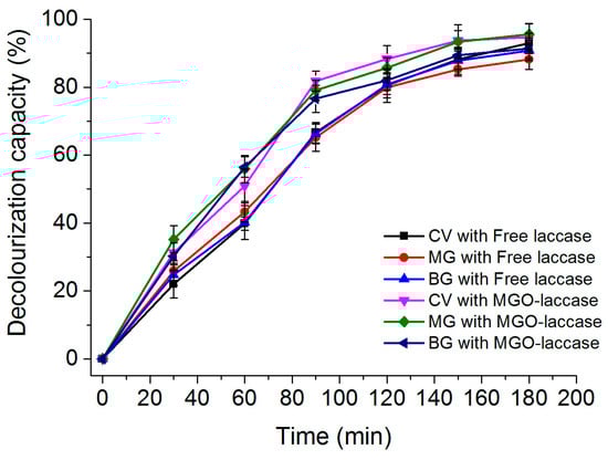 The decolorization capacities of various dyes including CV, MG, and BG using free laccase and MGO-laccase were both assessed. As shown in Figure 7, 93.0% of CV, 88.2% of MG, and 90.8% of BG was respectively decolorized after 180 min incubation with free laccase in the optimum conditions. Meanwhile, 94.7% of CV, 95.6% of MG, and 91.4% of BG was respectively decolorized with MGO-laccase after 180 min of incubation. However, as a comparison, the decolorization ability of MGO was tested, and the result showed that only 13.2% of dyes decolorized after 180 min of incubation was reached. In general, the decolorization capacities of free laccase were equal to or even lower than that of the immobilized laccase. Obviously, MGO-laccase exhibited good decolorization capacity to dye solutions in this work. Combined with the appropriate reusability in consecutive cycles of reuse, the MGO-laccase is suitable as material efficient in the decolorization of dyes from aqueous solutions.