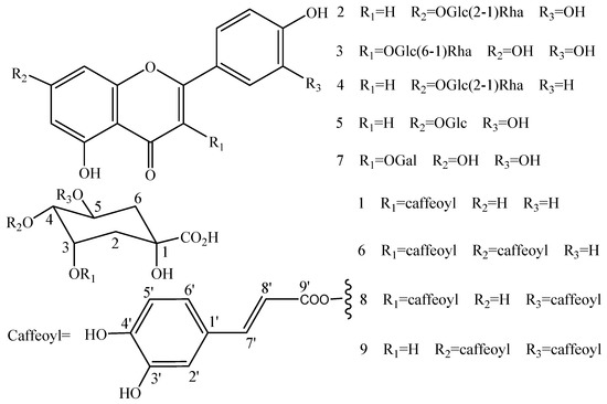 The present study is the first to use HSCCC and prep-HPLC guided by DPPH-HPLC experiments for the screening and preparative separation of flavonoid glycosides and caffeoylquinic acid derivatives from the leaves of L. japonica. Nine compounds were separated and their chemical structures were elucidated by electrospray ionization mass spectrometry (ESI-MS) and NMR. Their chemical structures are shown in Figure 1.