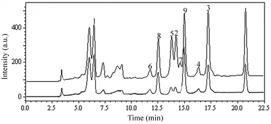 The n-butanol extract from leaves of L. japonica showed potential capacity to scavenge DPPH radical with an IC50 value of 11.2 µM (Table 1). This indicated that there were abundant antioxidant compounds in the n-butanol extract. Then, the DPPH-HPLC method was used to scan them. The chromatogram, detected at 254 nm, of the n-butanol extract that reacted with DPPH is shown in Figure 2. Seven of the compounds 1–9 in the extract were prominently reduced, indicating they possessed antioxidant activity. Based on the ratio of the reduced peak area, compounds 2, 4, 5 and 7 were the major compounds with antioxidant activity.
