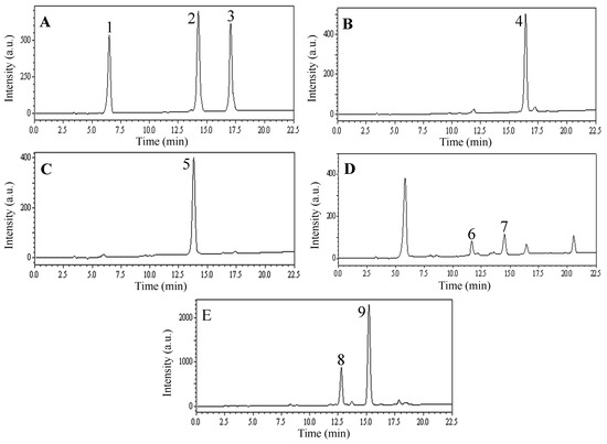 HPLC chromatograms of n-butanol extract and HSCCC peak fractions from leaves of L. japonica. ((A) F1 in Figure 3; (B) F2 in Figure 3; (C) F3 in Figure 3; (D) F4 in Figure 3; (E) F5 collected from the column after the separation). Experimental conditions: Shim-pack VP-ODS column (250 mm × 4.6 mm, i.d., 5 μm); Column temperature: 25 °C; Flow rate: 1.0 mL/min; Detection: 254 nm; Injection volume: 10 μL. HPLC conditions are as follows: Eluent A (MeOH) and eluent B (0.3% acetic acid in water, v/v), linear gradient combinations: at t = 0, 70% B; at t = 20 min, 40% B; at t = 22.5 min, 40% B. a.u.: arbitrary unit.