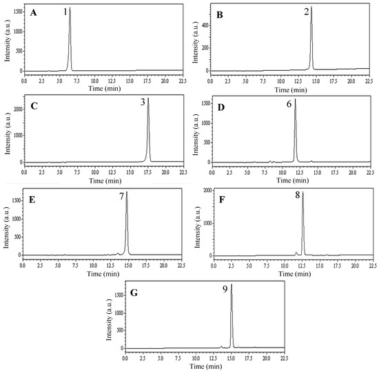 HPLC chromatograms of prep-HPLC peak fractions. ((A) chlorogenic acid, compound 1 in Figure 4A; (B) lonicerin, compound 2 in Figure 4A; (C) rutin, compound 3 in Figure 4A; (D) 3,4-O-dicaffeoylquinic acid, compound 6 in Figure 4D; (E) hyperoside, compound 7 in Figure 4D; (F) 3,5-O-dicaffeoylquinic acid, compound 8 in Figure 4E; (G) 4,5-O-dicaffeoylquinic acid, compound 9 in Figure 4E). a.u.: arbitrary unit.