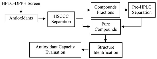 Our study demonstrated an efficient method using HSCCC and prep-HPLC guided by DPPH-HPLC experiments for screening and preparative separation of flavonoid glycosides and caffeoylquinic acid derivatives from leaves of L. japonica (Figure 6). As shown in Figure 2, it was difficult to separate peaks 1–9 using preparative HPLC directly due to their similar polarity. Using HSCCC followed by prep-HPLC, nine high purity flavonoid glycosides and caffeoylquinic acid derivatives could be obtained from the n-butanol extract of leaves from L. Japonica.