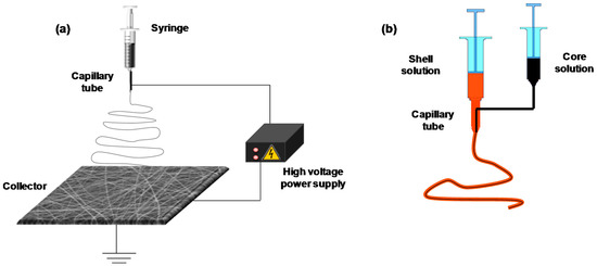 Electrospinning setup for the preparation of uniaxial fibers (a), and configuration of syringes and capillaries for preparation coaxial fibers (b).