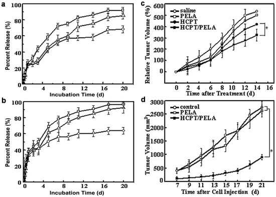 Release profiles of hydroxycamptothecin from poly(dl-lactic acid)-poly(ethylene glycol) (PELA) electrospun fibers containing (a) 1% or (b) 3% drug and various proportions in hydroxypropyl-β-cyclodextrin (HPβCD; 0.5% circles; 1.5% triangles; 2.5% squares), in phosphate buffer saline (PBS) medium at 37 °C. Tumor growth inhibition of H22 tumor bearing mice after intratumoral implantation of saline solution, free hydroxycamptothecin (HCPT) solution, blank PELA fibers and hydroxycamptothecin-loaded PELA fibers (c), and tumor development after injection of H22 tumor cells in a tissue pretreated with blank PELA fibers and hydroxycamptothecin-loaded PELA fibers or non-pretreated (control) (d). Reprinted from [61] with permission from Elsevier.