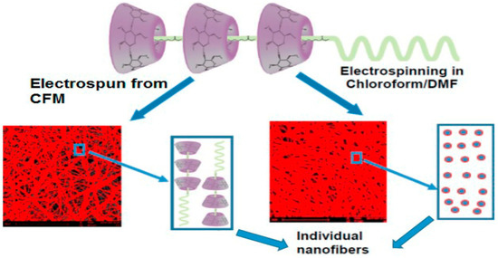 Electrospinning of α-cyclodextrin-poly(ε-caprolactone) (αCD-PCL) pseudorotaxanes dispersed in chloroform (CFM) led to fibers that retained the polypseudorotaxane structure, while in chloroform/dimethylformamide medium dethreading occurred and the fibers were formed by the individualized components. Reprinted with permission from [84]. Copyright (2016) American Chemical Society.
