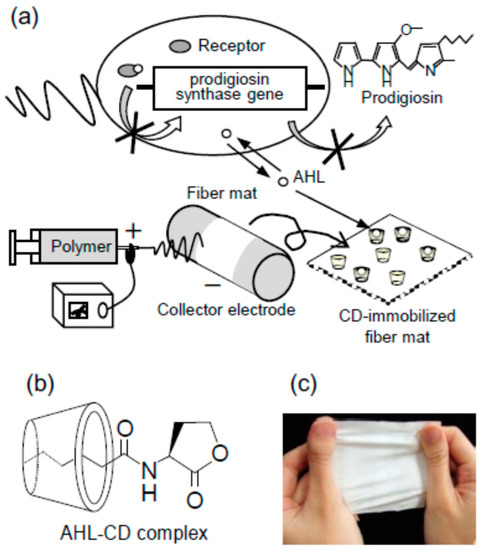 (a) Inhibition of Quorum Sensing-dependent prodigiosin production by CD-immobilized electrospun fiber mats; (b) Inclusion complex between CD and N-acyl-l-homoserine lactone (AHL); (c) Image of non-woven fiber mat electrospun from polyvinyl alcohol (PVA) solution. Reproduced from [94] with permission of The Materials Research Society of Japan.