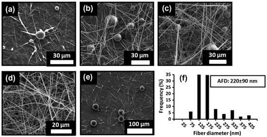 Scanning Electron Microscopy (SEM) images of electrospun fibers prepared with (a) 120% (w/v), (b) 130% (w/v), (c) 140% (w/v), and (d) 150% (w/v) βCD solutions in 10% NaOH medium, and (e) 150% (w/v) βCD solutions also containing 20% (w/w) urea in 10% NaOH medium. Diameter distribution of fibers prepared with composition (d) is shown in (f). Reproduced from [110] with permission from Elsevier.