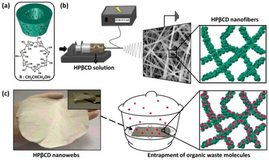 Removal of pollutants from air may be a promising application for fibers prepared with native or derivative CDs solely [34,112]. Combination of large specific surface area of nanofibers (compared to the respective CD powders) and ability to capture volatile organic compounds forming inclusion complexes makes these mats to be very effective for air filtration (Figure 6). Entrapment of aniline and benzene by electrospun HPβCD and HPγCD mats produced from aqueous or DMF solutions has been investigated [34]. HPγCD mats captured lower amount of organic molecules than HPβCD mats because HPγCD has bigger cavity size and less stable interactions can be established with the volatile compounds.