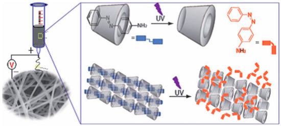 - Chen, M.; Nielsen, S.R.; Uyar, T.; Zhang, S.; Zafar, A.; Dong, M.; Besenbacher, F. Electrospun UV-responsive supramolecular nanofibers from a cyclodextrin–azobenzene inclusion complex. J. Mater. Chem. C 2013, 1, 850–855. [Google Scholar] [CrossRef]