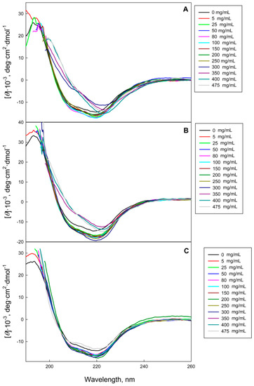 Far-UV CD spectra of GGBP in the presence of PEG of different molecular weight. (A): PEG-12000; (B): PEG-4000; (C): PEG-600.