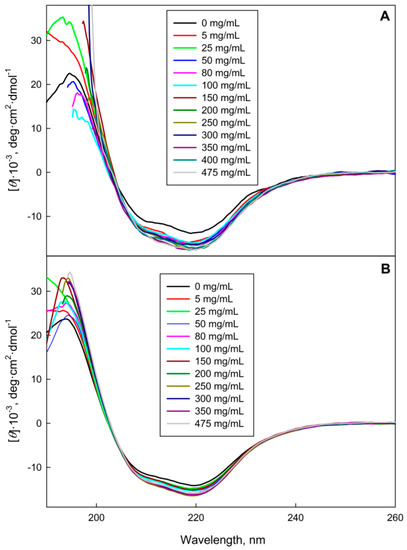 Far-UV CD spectra of GGBP in the presence of Ficoll-70 (A) and Dextran-70 (B).