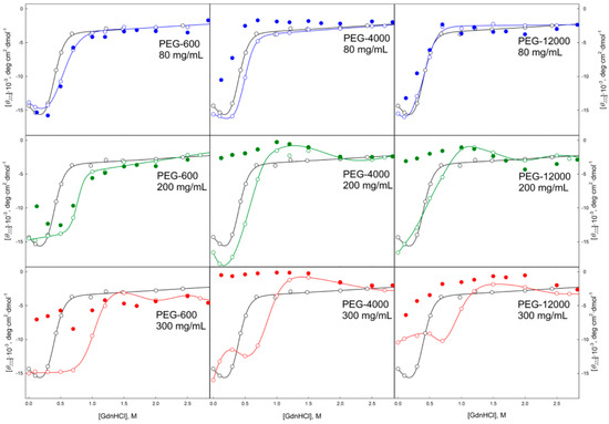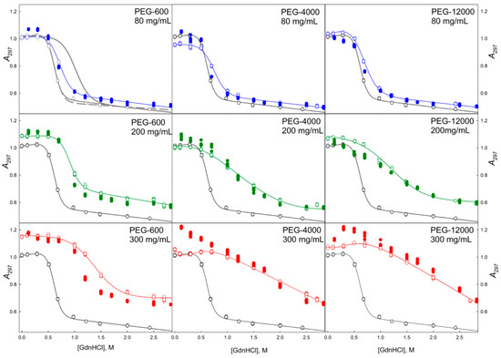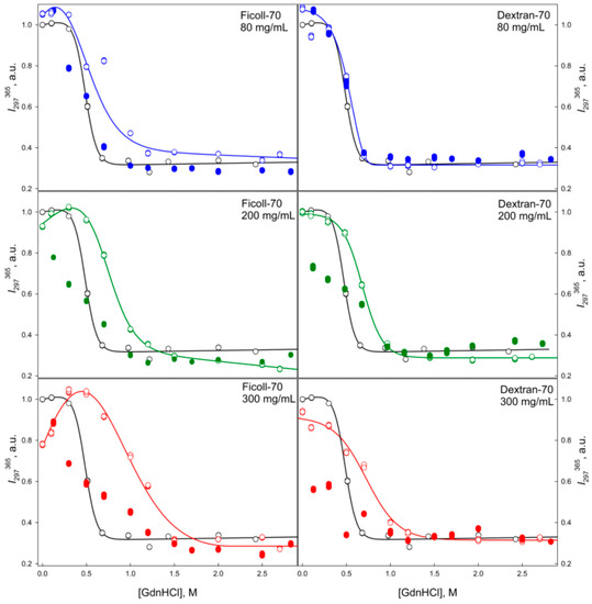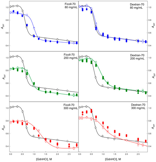 Data presented in Figure 4, Figure 5, Figure 6, Figure 7, Figure 8, Figure 9, Figure 10 and Figure 11 clearly show that in solutions containing 80 mg/mL of Dextran-70, Ficoll-70, and PEG (regardless of its polymerization degree), the unfolding curves of GGBP are shifted toward higher GdnHCl concentrations in comparison with the positions of the corresponding curves in the absence of crowding agents.