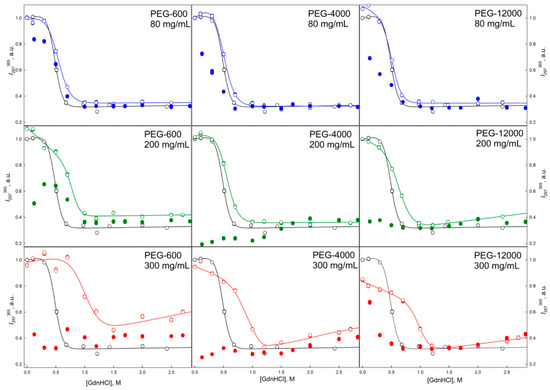 Unfolding/refolding transitions of GGBP in the presence of different concentrations of PEGs with different molecular weight recorded as the dependence of the intrinsic fluorescence intensity of GGBP on GdnHCl concentration. The excitation wavelength was 297 nm, the emission wavelength was 365 nm. Other designations as in Figure 4.
