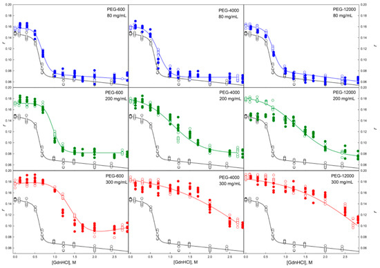 Unfolding/refolding transitions of GGBP in the presence of different concentrations of PEG of different molecular weight recorded by the dependence of the anisotropy of intrinsic fluorescence of GGBP on GdnHCl concentration. The excitation and emission wavelengths were 297 and 365 nm, respectively. Other designations as in Figure 4.