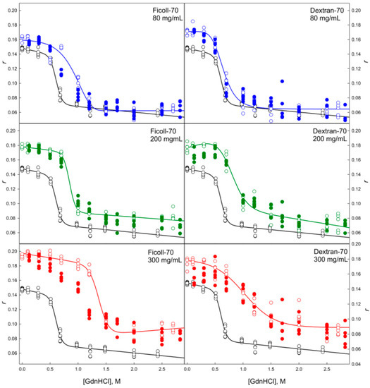 Unfolding/refolding transitions of GGBP in the presence of different concentrations of Ficoll-70 and Dextran-70 recorded as the dependence of the anisotropy of intrinsic fluorescence on GdnHCl concentration. The excitation wavelength was 297 nm, the emission wavelength was 365 nm. Other designations as in Figure 4.