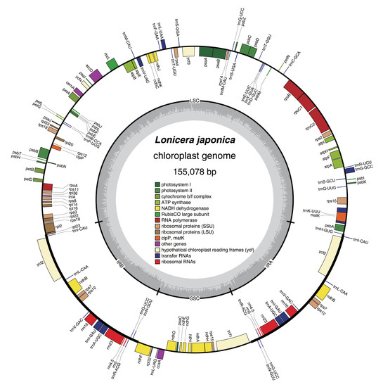 In higher plants, photosynthesis occurs in the cp, to provide the essential energy needed for plant growth and survival. New leaves of L. japonica have higher photosynthetic rates than other Lonicera species, whether they are under the forest canopy or in the open [7]. The annual carbon gain for Japanese honeysuckle was much greater in different light environments [10]. However, the molecular mechanism of photosynthetic adaptability of L. japonica is still beyond our outstanding. The lack of the cp genome of L. japonica has become a bottleneck for investigating whether there are links between L. japonica’s high level adaptability and photosynthetic adaptability, as well as chloroplast function. With rapid advances in sequencing technologies, Herbgenomics provides an effective tool to uncover the genetic information of herbs and to clarify their molecular mechanisms in related biological responses [11,12].