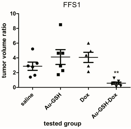 Volume ratio of tumours grown from the FFS1 cell line 72 h after a single intratumoural injection of the following compounds: saline (as a control) (●), Au-GSH (■), Au-GSH-Dox (▼), Dox (▲) compared to the tumour volume before treatment. ** p < 0.01 was assigned as highly significant.