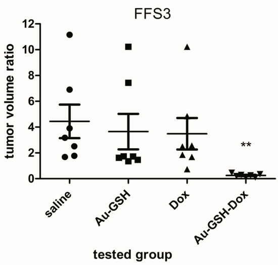 The volume of all tumours grown from FFS1 and FFS3 cell lines was enlarged 72 h after a single intratumoural injection of both saline and Au-GSH. The average volume ratios for tumours from the FFS1 cell line were 2.62 and 3.75 after saline and Au-GSH injection, respectively (Figure 1). The average tumour volume ratios for tumours from the FFS3 cell line were 4.44 and 3.65 after saline and Au-GSH injection, respectively (Figure 2). There were no significant differences between the tumour volume ratio after injections of Dox, Au-GSH and saline, which indicates that doxorubicin is inefficient at the tested dose. The tumour volume ratios after the injection of Dox for tumours from the FFS1 and FFS3 cell lines were 5.58 and 3.39, respectively. On the other hand, there was a highly significant reduction in tumour volume ratio after a single Au-GSH-Dox injection (p < 0.01) (Figure 1 and Figure 2). The average tumour volume ratio after the injection of Au-GSH-Dox for tumours from the FFS1 cell line was 0.57 (six out of seven tumours decreased) (Figure 1) and for tumours from the FFS3 cell line it was 0.27 (all tumours decreased) (Figure 2). The results obtained in the presented in vivo studies indicate that intratumoural injections of Au-GSH-Dox may be effective in FISS treatment.