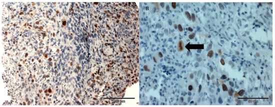 A positive Ki-67 expression was detected in the nuclei of tumour cells of feline injection-site sarcoma grown from the FFS3 cell line after a single intratumoural injection of Au-GSH-Dox. Scale bar = 100 μm (A), the arrow indicates a mitotic figure staining for Ki-67. Scale bar = 50 μm (B).
