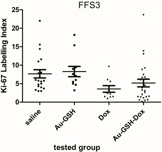 Fibrosarcomas grown from FFS1 cell lines showed no expression of Ki-67 in tumours from all tested groups. Fibrosarcomas grown from the FFS3 cell line had low Ki-67 expression (Figure 3) (ranging between 0% and 23.6%) in tumours from all tested groups, however, there were no statistically significant differences in Ki-67 expression in tumours after the injection of saline, Au-GSH, Au-GSH-Dox and Dox alone (Figure 4).