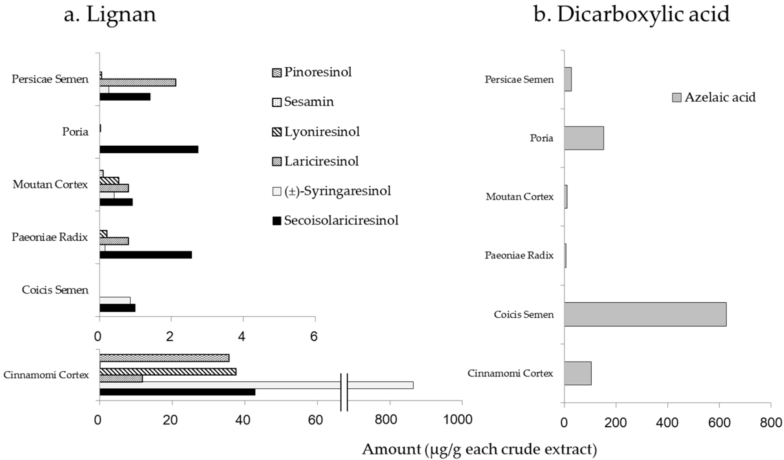 Lignans and dicarboxylic acids are contained in most plants, thus we examined the representative compounds in every component crude drug. Lignans were the most abundant in the extract of Cinnamoni Cortex, with (±)-syringaresinol particularly prominent (Figure 1a). Azelaic acid is used widely for the treatment of dermatitis such as rosacea and acne vulgaris [23,24], thus we determined its amounts in the component crude drugs. Our results demonstrated that the highest concentration of azelaic acid was found in the extract of Coicis Semen (Figure 1b).
