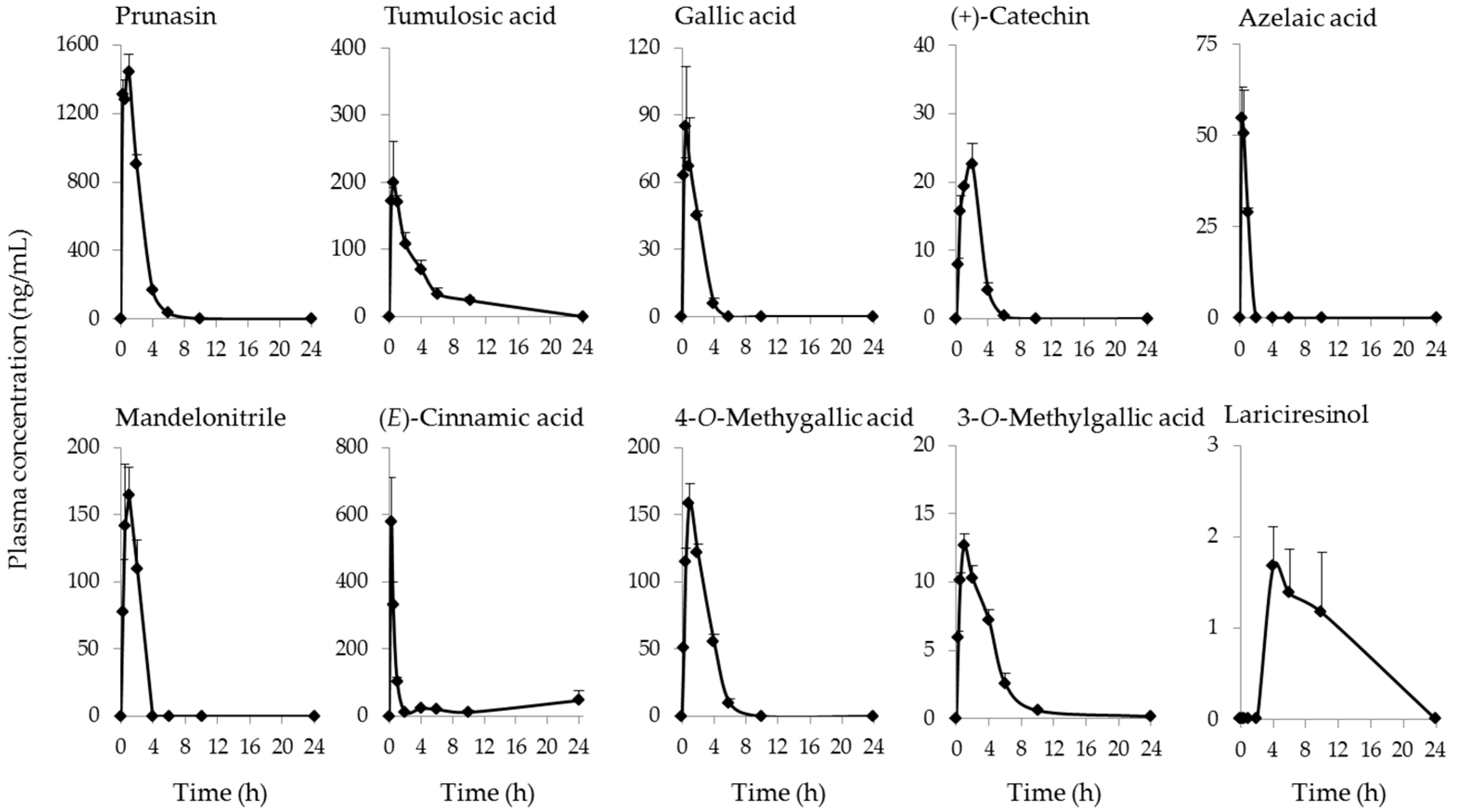 Time-courses of representative constituents in the plasma of KBGY-treated rats. Plasma samples were obtained at 0.25, 0.5, 1, 2, 4, 6, 10 and 24 h after single administration of KBGY (2 g/10 mL/kg, p.o.). Prunasin, tumulosic acid, gallic acid, (+)-catechin, mandelonitrile, (E)-cinnamic acid, 4-O-methylgallic acid, 3-O-methylgallic acid, azelaic acid, and lariciresinol in the plasma were measured by LC/MS/MS or GC/MS. Each data point represents the mean ± S.E. of triplicate results.