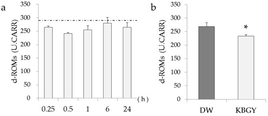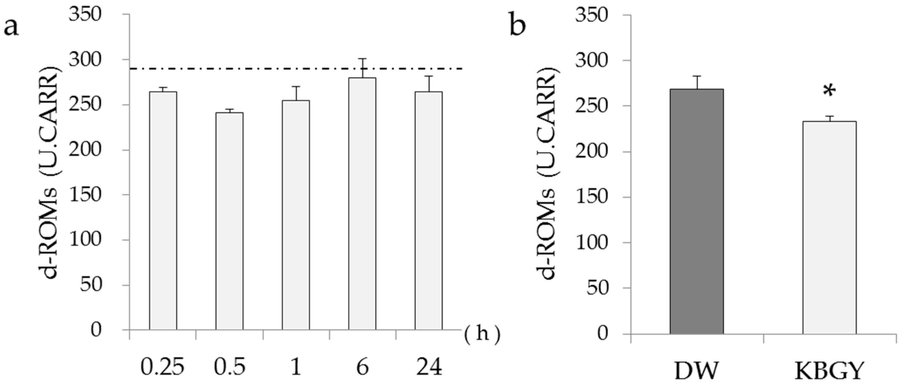 Decreased level of reactive oxygen metabolites by administration of KBGY. Plasma samples were obtained at 0.25, 0.5, 1, 2, 4, 6, 10 and 24 h after single administration of KBGY (2 g/10 mL/kg, p.o.). The levels of diacron-reactive oxygen metabolites (d-ROMs) in plasma were evaluated. (a) Time-course was investigated (n = 3). The levels of d-ROMs of the plasma obtained from non-administrated rats were represented as dashed lines; (b) Plasma samples were obtained 0.5 h after the administration of KBGY or distilled water (DW). Data are shown as the mean ± S.E. of 10 rats. * p < 0.05 indicates significant versus DW group from the unpaired Student’s t-test.