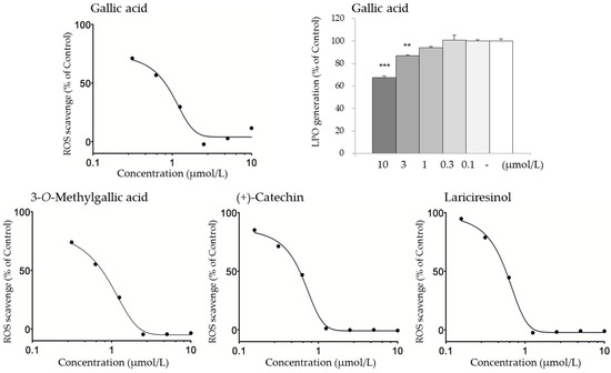 In addition, gallic acid, 3-O-methylgallic acid, (+)-catechin, and lariciresinol exhibited concentration-dependent antioxidant effects, showing that the IC50 of these compounds were 0.954, 0.744, 0.621 and 0.561 μmol/L respectively.