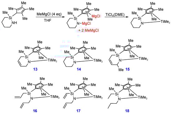 The metalation of 6 using the methods introduced by Resconi et al. (treatment of 4 equiv. of MeLi in diethyl ether then with TiCl4) was unsuccessful [45,46]. The action of MeLi on 6 did not afford the desired dilithium compound (MeC5(Li)-Si(Me)(CH2CH=CH2)-N(Li)(CH2CH=CH2)), but instead resulted in destruction of the ligand framework. However, treatment of 6 with 4 equiv. of MeMgCl for a rather long reaction time (three days) in tetrahydrofuran (THF) at room temperature cleanly generated the desired dianion (MeC5(MgCl)-Si(Me)(CH2CH=CH2)-N(MgCl)(CH2CH=CH2)). Addition of TiCl4(DME) to the resulting solution containing the dianionic species and remaining 2 equiv. of MeMgCl afforded the desired complex 13 (Chart 2) in moderate yield (63%). The 1H-NMR spectrum showed Ti-Me and Si-Me signals at 0.59, 0.46, and 0.43 ppm as singlets, while C5Me4-signals were observed at 1.98, 1.96, 1.94, and 1.87 ppm as singlets. The two protons on -NCH2- are diastereotopic to each other and their signals were widely separated at 5.47 and 4.63 ppm with a large geminal coupling constant (2J = 19.5 Hz). The two =CH signals were observed at 5.7 and 5.5 ppm as multiplets (Figure 1). Complex 14 was also successfully prepared from 9 (hydrogenated compound of 6) by the same method under the same conditions (treatment with 4 equiv. of MeMgCl and subsequent addition of TiCl4(DME)). The 1H-NMR spectrum of 14 (Figure 1) shows signals of the two diastereotopic -NCH2- protons at 5.18 and 3.65 ppm, indicating a notable up-field shift relative to the corresponding chemical shifts of 13 (5.47 and 4.63 ppm). When 7 (RCM precursor bearing a methyl substituent at the α-position of the amino group) was treated with MeMgCl, deprotonation was sluggish. Treatment of 2 equiv. of nBuLi in diethyl ether cleanly precipitated the dilithium compound, which was subsequently treated with TiCl4(DME) and 2 equiv. of MeMgCl simultaneously to afford the desired titanium complex 15. Having two chiral centers, 15 was obtained as a mixture of two diastereomers and the 1H- and 13C-NMR signals were rather complex. Titanium complexes 16 and 17 were successfully generated from the respective RCM precursors 3 and 10. In these cases, treatment of nBuLi in diethyl ether cleanly precipitated the corresponding dilithium compounds, from which the desired complexes were generated in good yields (84% and 88%) by treatment with TiCl4(DME) and 2 equiv. of MeMgCl. The vinyl groups in 17 were hydrogenated using a Pd/C catalyst to obtain 18 ([Me(Et)Si(η5-Me4C5)(κ1-NPr)]TiMe2). All complexes, except for 14, were oily in nature with high solubility in hexane, and resistant to recrystallization, but the crude products extracted using hexane were pure based on 1H- and 13C-NMR analyses. Complex 14 was crystalline, but the crystals were formed as thin needles that were unsuitable for X-ray crystallography.