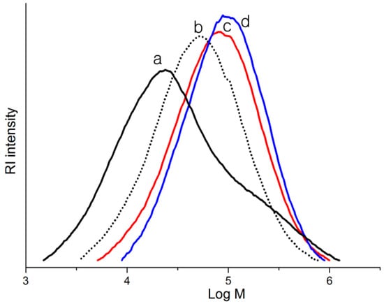 Gel permeation chromatography (GPC) curves of polymers generated with constrained-geometry catalyst (CGC)/[Ph3C][B(C6F5)4]/iBu3Al (a, entry 7), 14 (b), 13 (c), and 18 (d) activated with [Ph3C][B(C6F5)4]/[iBu2Al]2O.