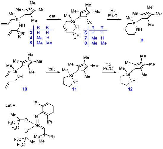 The present strategy for construction of the [1,2]azasilinane framework involves the ring closure metathesis (RCM) of the two olefin units attached to the nitrogen and silicon atoms (Scheme 1). The precursor (3, Me4C5H-Si(Me)(CH2CH=CH2)-NH(CH2CH=CH2)) for RCM was easily prepared according to the scheme applied in the construction of the prototype CGC ligand by using commercially available chemicals, tetramethylcyclopentadiene (Me4C5H2), allyl(dichloro)methylsilane ((CH2=CHCH2)(Me)SiCl2), and allylamine. Initial RCM trials of 3 using Ru-catalysts (Grubbs 1st and 2nd generation catalysts and Hoveyda–Grubbs catalyst) for the synthesis of 6 were unsuccessful [40]. No ethylene gas was detected in the reaction monitored by 1H-NMR. Instead, migration of the double bond in the allylamine unit was observed. In contrast, the Mo-catalyst (Schrock catalyst, 2 mol %) cleanly converted 3 to the desired cyclic compound 6 [41,42,43,44]. When a closed-NMR tube with C6D6 was used, the signal of generated ethylene was observed at 5.24 ppm and the vinyl signals that were observed in the spectrum of 3 at 4.8–5.2 ppm and 5.7–5.9 ppm completely disappeared, while two new =CH signals were observed at 5.8 and 5.5 ppm (Figure 1). The RCM product 6 could be separated from the Mo-catalyst by vacuum distillation at 60 °C. The derivatives bearing methyl substituents at the α-position of the amino group (7 and 8) were also successfully prepared by RCM of the corresponding precursors 4 and 5, which were prepared using 1-methylallylamine or 1,1-dimethylallylamine instead of allylamine. Hydrogenation of 6 using a Pd/C catalyst afforded 9 bearing the desired [1,2]azasilinane framework; the double bonds in the tetramethylcyclopentadiene units remained intact during the hydrogenation process. The characteristic vinyl signals in the 1H-NMR spectrum of 6 completely disappeared after hydrogenation. However, hydrogenation of the derivatives 7 and 8 bearing methyl substituent(s) at the α-position of the amino group was unsuccessful; the substrates remained intact under the identical hydrogenation conditions using the Pd/C catalyst. The five-membered analogue 11 was also successfully prepared via RCM of the vinylsilane derivative using the same Mo catalyst. Hydrogenation of 11 using the Pd/C catalyst was also successful to afford 12 bearing the [1,2]azasilolidine framework (Scheme 1).