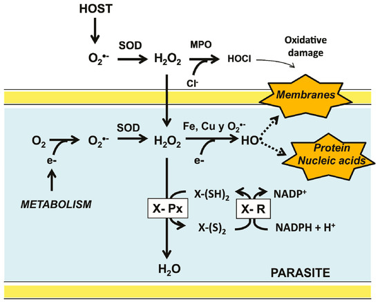 Major pathways for ROS production in invertebrate parasites inside its host and the antioxidant defense system. Superoxide anion (O2−) is produced as a metabolic byproduct in both the parasite and its host. To contend with the deleterious effect of its ROS derivatives, a typical antioxidant defense system is present in the parasite. It is constituted by a thiol-dependent peroxidase (X-Px) which transfers electrons from a reduced donor substrate (X-(SH)2) to H2O2. The resulting oxidized form of the substrate [X-(S)2] is then reduced by a specific disulfide reductase.