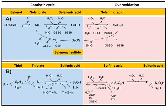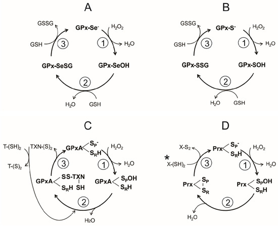 The catalytic cycle of the Sec-dependent GPx can be summarized in the following three steps (Figure 4A):