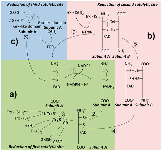 The catalytic mechanism of most of the members of the Trx superfamily involves both cysteine residues of the CXXC redox motif. In the catalytic cycle the N-terminal cysteine residue, called the catalytic Cys, acts as a nucleophilic reagent. Its pKa value of 7.2 suggests at physiological pH values a significant fraction of the sulfhydryl group of such Cys is in the thiolate dissociated state –S− [84]. The anionic form stabilizes through hydrogen bonds with basic residues [85]. As for the C-terminal cysteine residue, its presence is essential in those reactions involving disulfide reduction (Figure 2B). The nature of the residues located between both catalytic Cys depends on the specific protein.