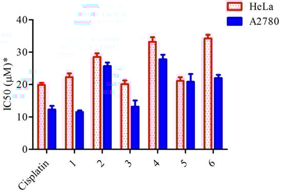 Cytotoxic activity of in vitro of Compounds 1–6 against HeLa and A2780 tumor cells. * Data are reported as IC50 values determined by MTT assay after 24 h of continuous exposure to each compound. The values were calculated using sigmoidal dose-response relationship. The data represents mean values ± SEM (standard error of mean) of at least three independent experiments.