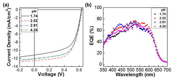 (a) Light J-V curves according to the pH of PEDOT:PSS layers for the P3HT:PC61BM solar cells under illumination with a simulated solar light (air mass 1.5G, 100 mW/cm2); (b) EQE spectra for the P3HT:PC61BM solar cells according to the pH of PEDOT:PSS layers.