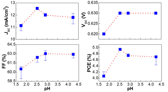 Next, the current density–voltage (J-V) characteristics of the P3HT:PC61BM solar cells with the PEDOT:PSS-AN layers were measured under illumination with a simulated solar light (air mass 1.5 G, 100 mW/cm2). As shown in Figure 2, the light J-V curves were improved by the aniline-doped PEDOT:PSS (PEDOT:PSS-AN) layers. In particular, the light J-V curve at pH = 2.52 was better than any other J-V curves, implying an optimum aniline content for the best performance in the given device structure. It is worthy to note that the short circuit current density (JSC) was pronouncedly changed but the open circuit voltage (VOC) was only marginally varied according to the pH change. This result indicates that the charge transport in the devices might be considerably affected by the different pH of PEDOT:PSS-AN, whereas the photovoltage level was minimally influenced by the pH change.