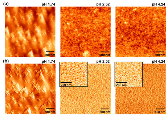 AFM images (a: height-mode, b: phase mode) for the pristine PEDOT:PSS (pH = 1.74) and PEDOT:PSS-AN layers (pH = 2.52 and 4.24) coated on the ITO-glass substrates. The scan size of images was 3 μm × 3 μm (inset: 1 μm × 1 μm).