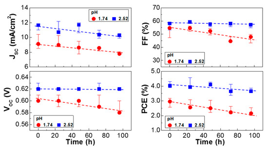 Taking into account the correlation between the device performance and the domain size, two small domains are considered to deliver an adverse effect in terms of charge transport as discussed on the conductivity ratio in Figure 1b. Finally, the stability of the P3HT:PC61BM solar cells with the pristine PEDOT:PSS layer (pH = 1.74) and the PEDOT:PSS-AN layer (pH = 2.52) was briefly tested under continuous (100 h) illumination with a simulated solar light (air mass 1.5 G, 100 mW/cm2). As shown in Figure 5, the light J-V curve was slightly changed after 100 h illumination for both pH = 1.74 and 2.52. The major change can be ascribed to the reduced JSC in the presence of marginal decrease in VOC. The overall trend for >10 devices is plotted in Figure 6. The JSC value was very similarly reduced with the illumination time for both devices, which may indicate the same origin on the charge collection in devices. Interestingly, the VOC decay was very small for the devices with the PEDOT:PSS-AN layers, whereas it was relatively quite large for those with the pristine PEDOT:PSS layers. The similar trend was measured for the FF trend. Considering both VOC and FF trends, it is shortly concluded that the reduced pH in the PEDOT:PSS-AN layers might have a positive influence on the prevention of degradation at the interfaces between the BHJ layer and the hole-collecting layer or between the ITO electrode and the hole-collecting layer. Consequently, the PCE decay was relatively slower for the devices with the PEDOT:PSS-AN layers than those with the pristine PEDOT:PSS layers.