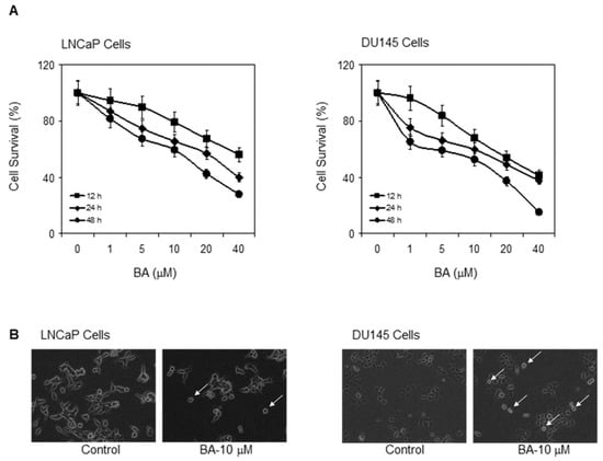 2.1. Cytotoxic Effect of BA in Prostate Cancer Cells
