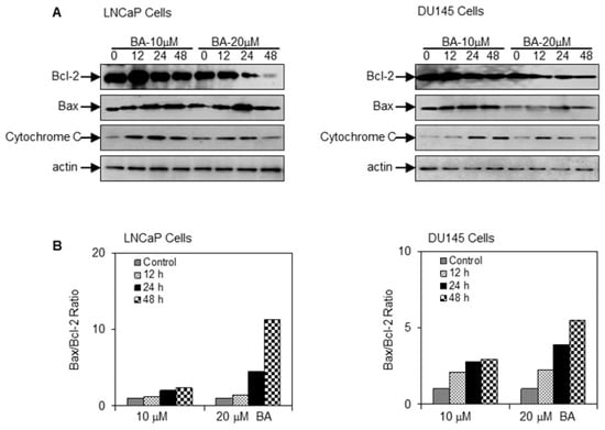 2.3. BA Induces Apoptosis by Altering Bax/Bcl-2 Ratio and Causing Cyctochrome C Release in Prostate Cancer Cells