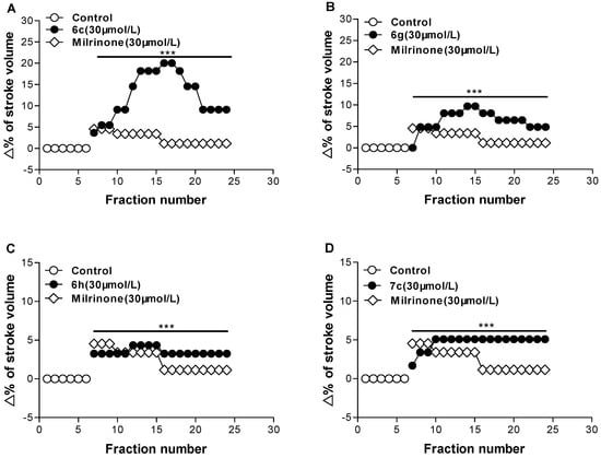 Effects of milrinone and compounds 6c, 6g, 6h, and 7c on stroke volume in beating rabbit atria (1.5 Hz). Values are means ± SE. *** p < 0.001 vs. control. (A): effects of compound 6c on stroke volume in beating rabbit atria, (B): effects of compound 6g on stroke volume in beating rabbit atria, (C): effects of compound 6h on stroke volume in beating rabbit atria, (D): effects of compound 7c on stroke volume in beating rabbit atria.