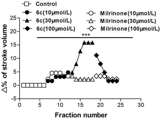 Concentration-response curves of compounds 6c and milrinone on stroke volume in beating rabbit atria (1.5 Hz). Values are means ± SE. *** p < 0.001 versus control.