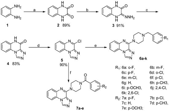 Synthetic scheme for the synthesis of compound 6a–k and 7a–e. Reagents and conditions: (a) C6H10O4, reflux, 4 h; (b) NH2NH2H2O, reflux, 4 h; (c) CH(OC2H5)3, reflux, 3 h; (d) POCl3, Methylbenzene/DMF, reflux, 3 h; (e) monosubstituted piperazines, K2CO3, acetone, reflux, 5 h; (f) monosubstituted piperazines, K2CO3, acetone, reflux, 8 h.